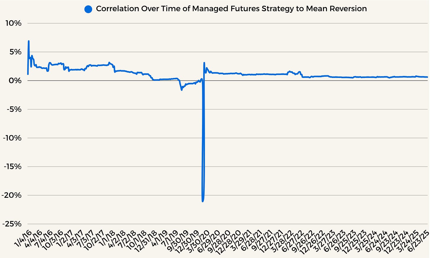 Over time the correlations are essentially never over 5% and if we did correlations between the Managed Futures Strat without Mean Reversion overlay, we would see correlations firmly in the negatives throughout this time period. Therefore, this is further confirmation that this is an effective overlay to add to our book.