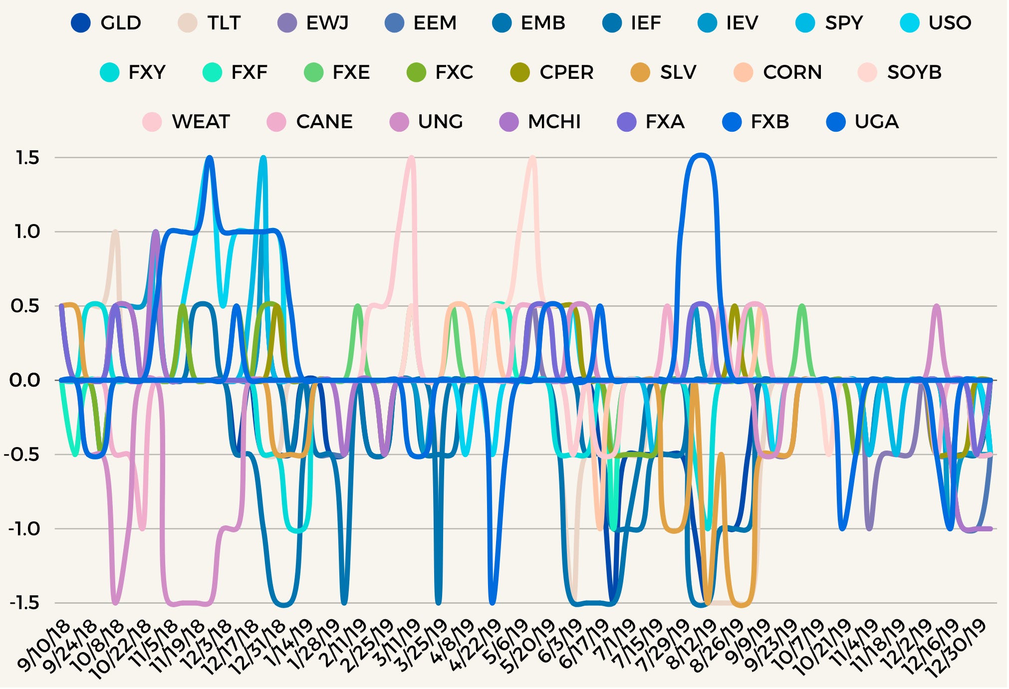 Let’s now get into the signals and what it’s doing and when. I’ll pick a random point in time with the signals so we can overlay them on a chart. Otherwise, it will be difficult to see and interpret what we’re looking at with so many signals for different assets.